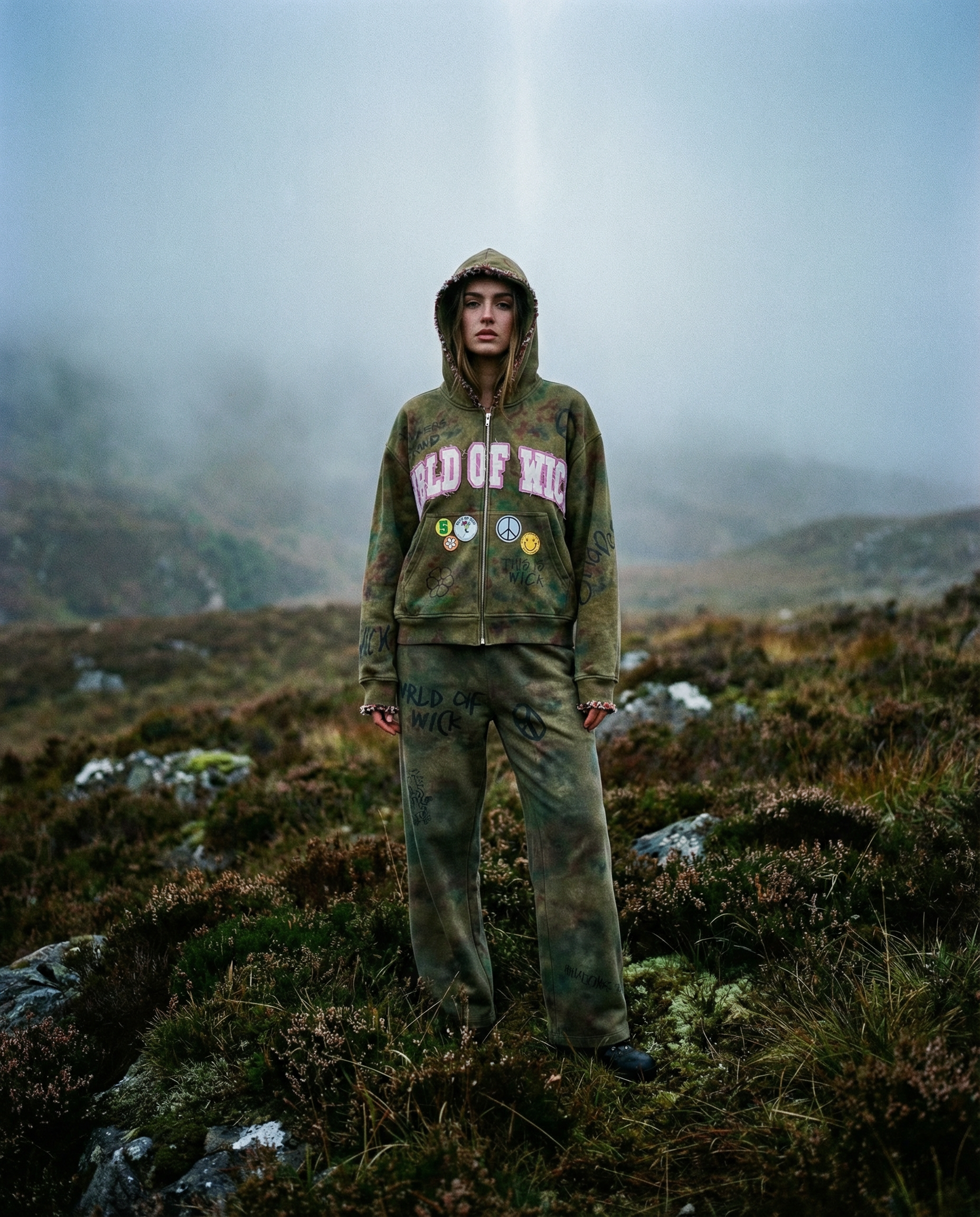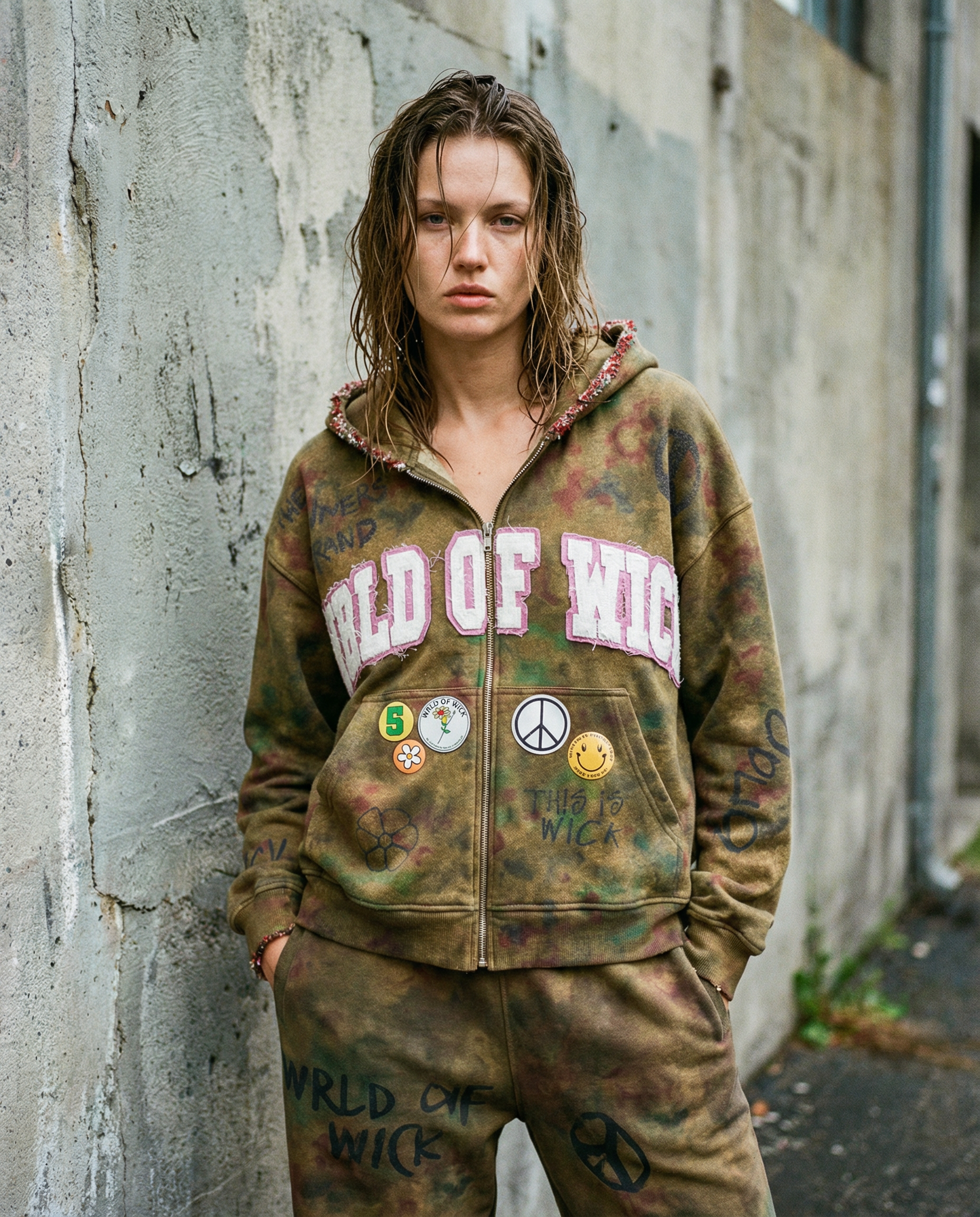 Cracked ink and textured appliqué logo detailing