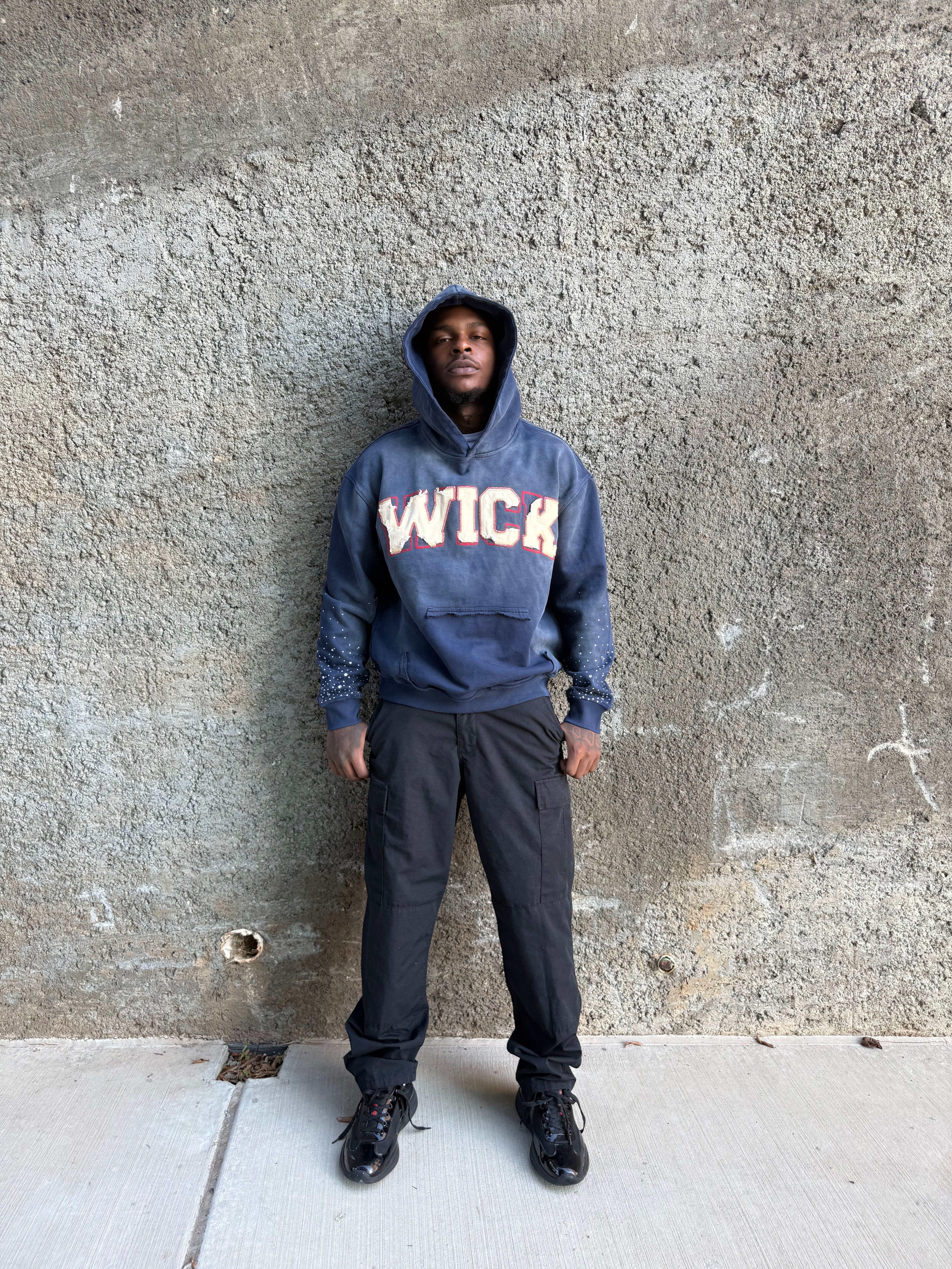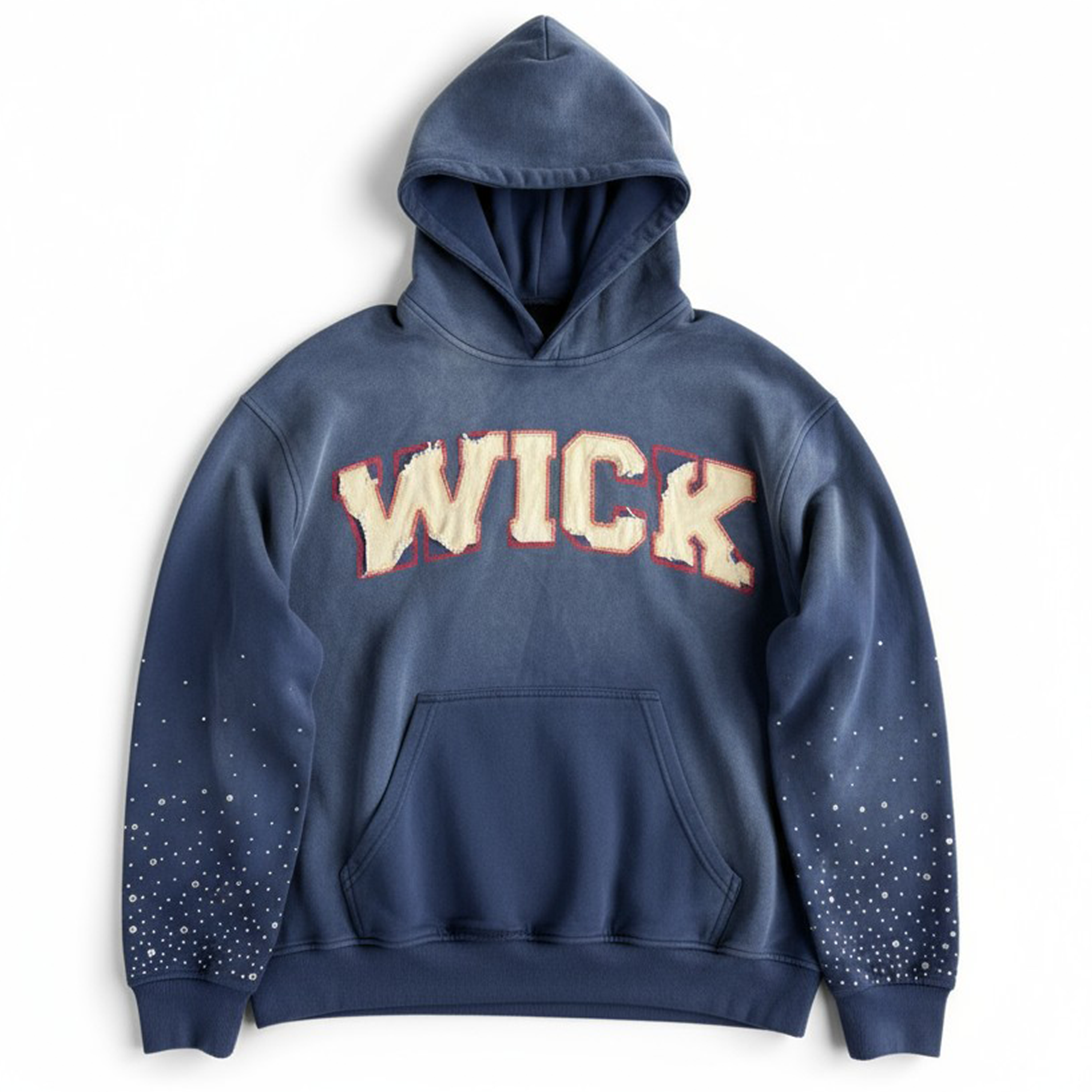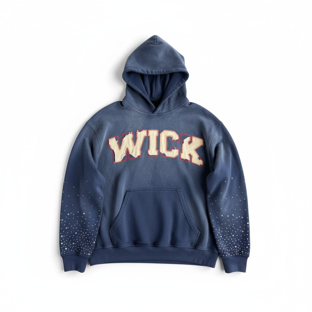 A statement piece that does all the talking. The WICK Burnout Hoodie (Navy) mixes vintage distressing with luxury sparkle — built for anyone who wants their fit to hit different. The faded navy base has that lived-in streetwear look, paired with shredded varsity WICK lettering that feels raw, loud, and unapologetic.