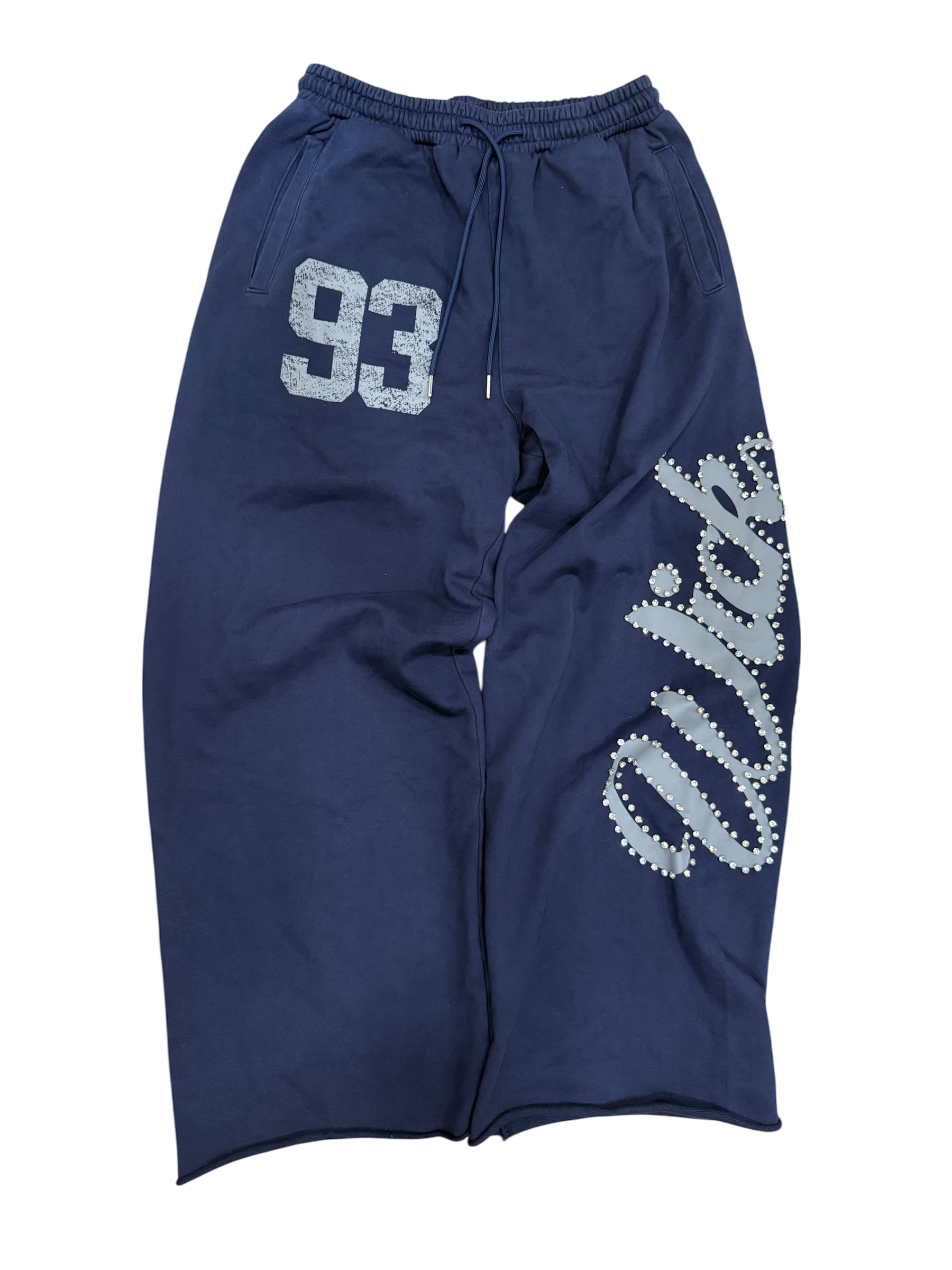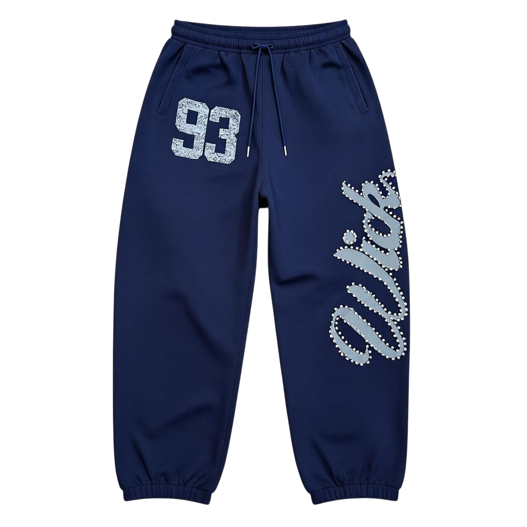 Step into standout comfort with the WICK “93” Rhinestone Sweatpants. Designed in deep navy, this piece blends athletic energy with luxury streetwear vibes. The bold 93 print on the left thigh brings a vintage sports feel, while the oversized Wick script down the leg is outlined in clean, eye-catching rhinestones for a premium shine.