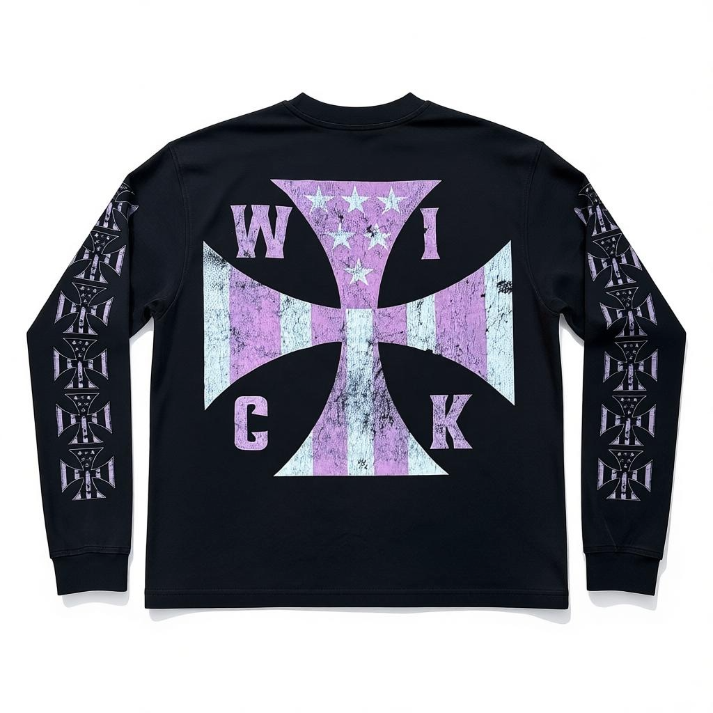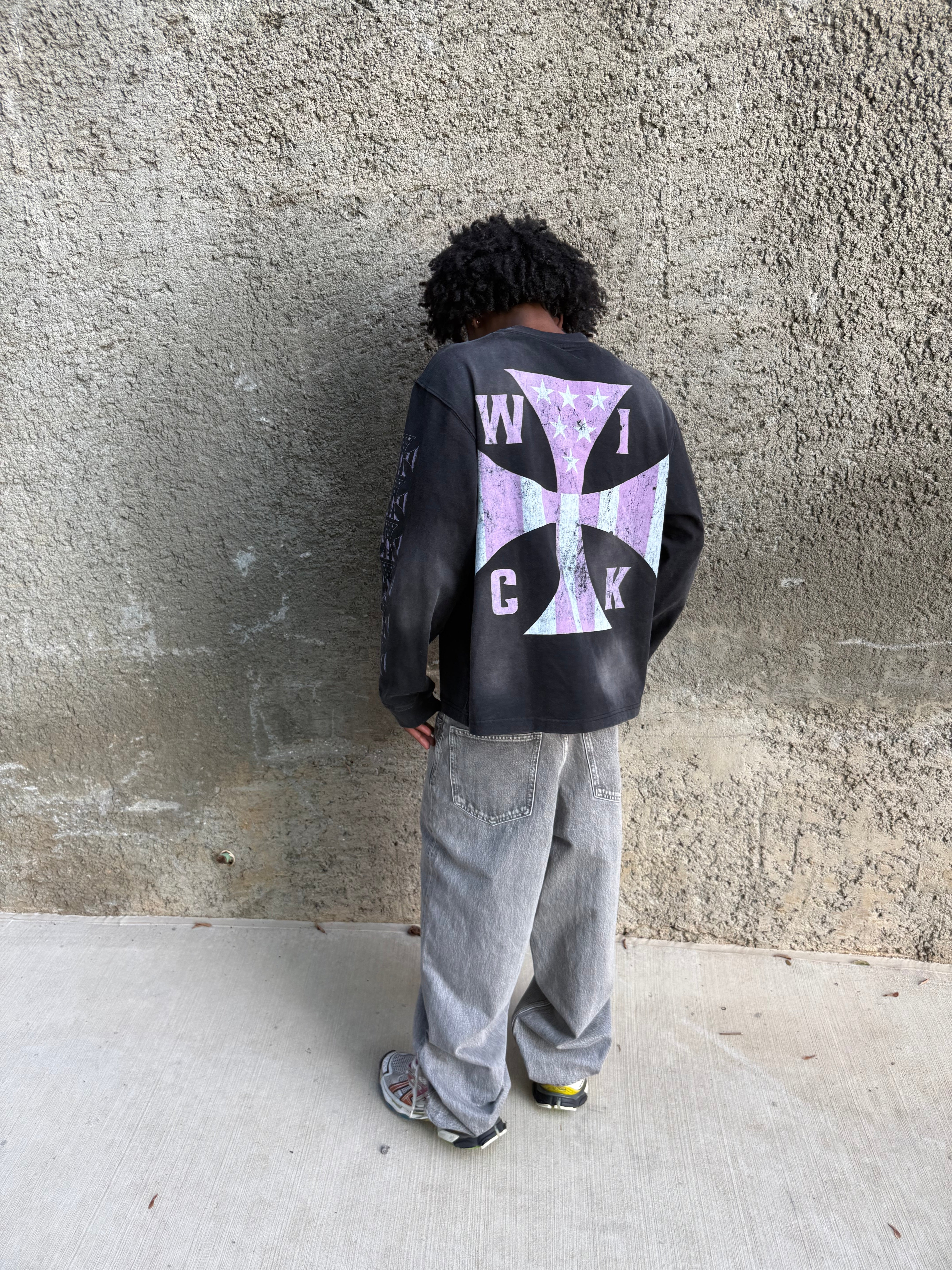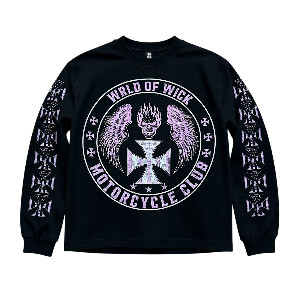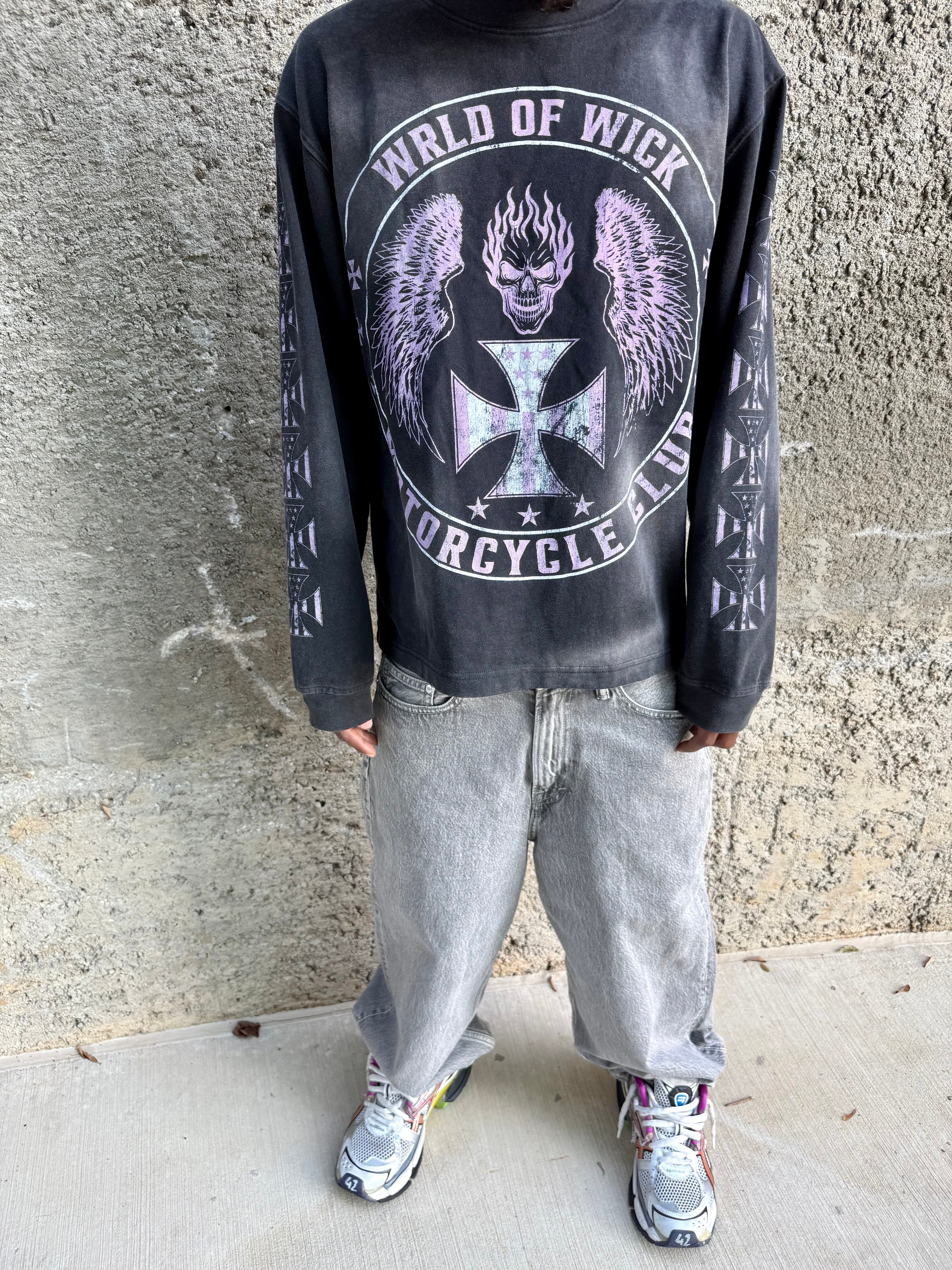A bold staple for everyday wear. This heavyweight long sleeve features a custom acid-wash finish, a detailed WICK Motorcycle Club™ emblem on the front, and an oversized distressed WICK cross on the back. Sleeve graphics complete the look.